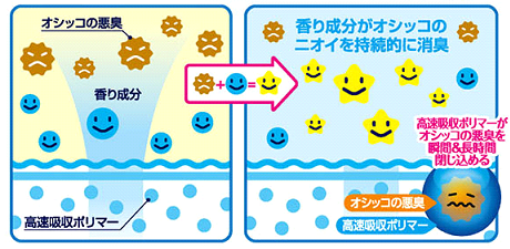 1. 「高速吸収ポリマー」と「ふんわりアロマ成分」のダブル消臭で、瞬間消臭&長時間消臭を実現しました。