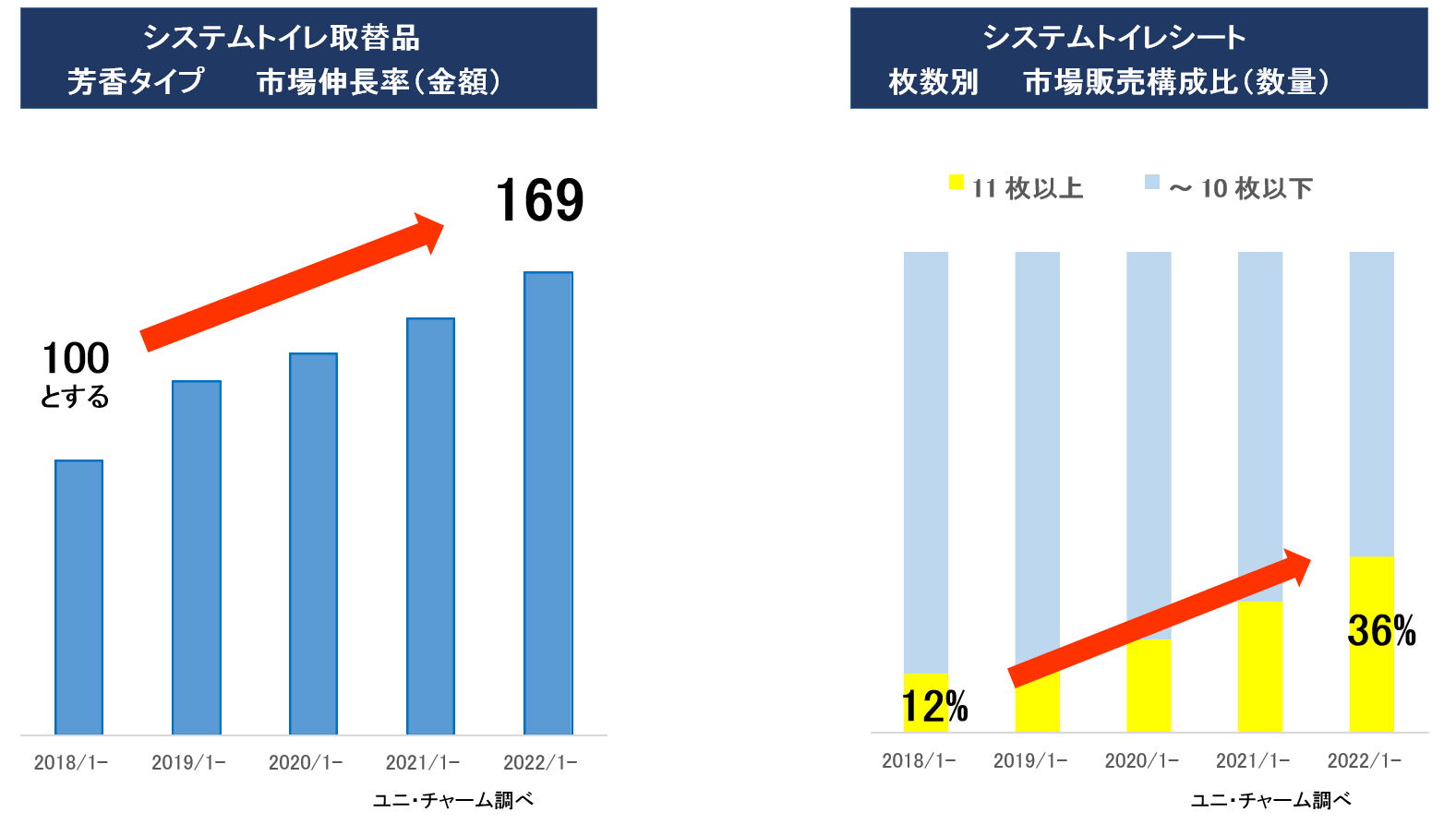 新型コロナウイルス感染拡大により在宅時間が増えたことで、猫の排泄物のニオイに不満を感じて、猫用システムトイレの交換シート等において“芳香タイプ”が伸長しています。また、システムトイレシートでは “大入り数”の販売構成比が、コロナ前の2018年と比較して約3倍に拡大しています。