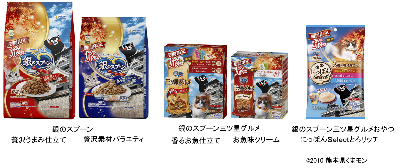 ユニ・チャーム株式会社(代表取締役 社長執行役員:高原豪久)は、 ネコちゃんの飼い主様にご好評をいただいている、日本各地の厳選素材を使用した“旅気分企画”※1として、熊本県産の“あごだし”味パウダー・フレークを使用したフード・おやつ7品目を、2022年8月15日に全国で期間限定品として発売しました。今回は、熊本県のご当地キャラクター「くまモン」が登場して、旅気分を高めてくれます。