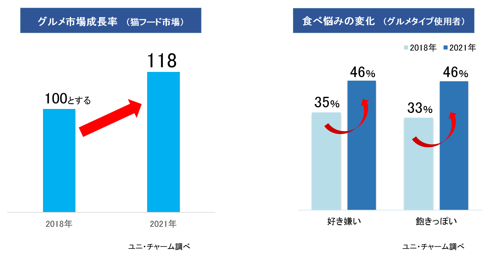 コロナ禍において、家でネコちゃんと接する時間が増える中、飼い主様の「喜んでよく食べてほしい」だから「よりおいしそうなものを選ぶ」という意識が高まり、猫フード市場ではグルメタイプが拡大しています。一方で、グルメタイプを使用している飼い主様は、「好き嫌い」や「食べ飽き」など、ネコちゃんの“食”に関する悩みを抱えています。