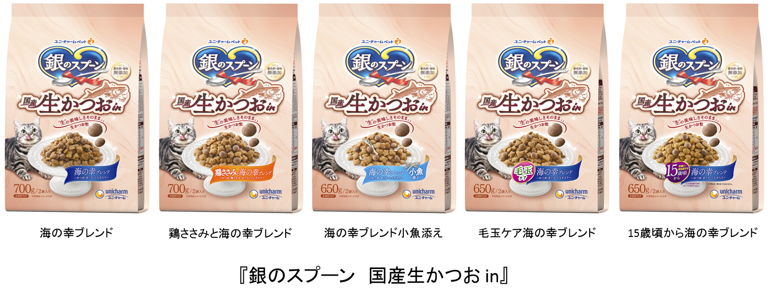ユニ・チャーム株式会社(代表取締役 社長執行役員:高原豪久)は、 “美味しくて安心”なフードを求めているネコちゃんの飼い主様のご要望にお応えし、『銀のスプーン 国産生かつおin 』を、2022年9月5日に全国で発売します。