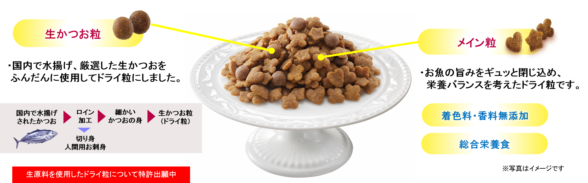 (1)生かつお粒をたっぷりブレンドし、ネコちゃんが喜ぶかつお本来の味や香りが楽しめます。