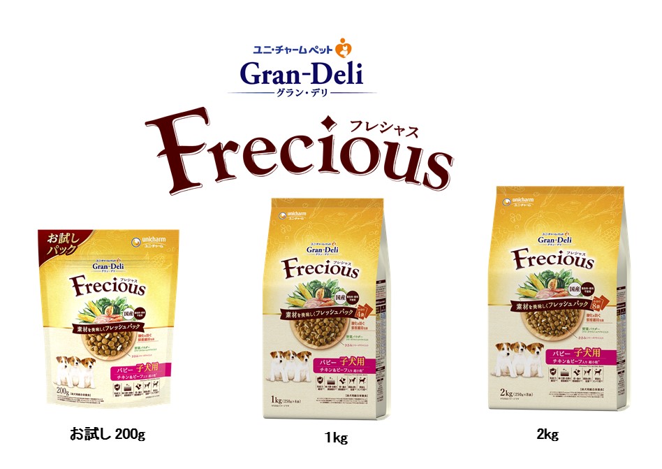 そこでこのたび、栄養価はそのままに、高い嗜好性を実現することでご好評をいただいているプレミアムフード『Gran-Deli Frecious』から「子犬用チキン&ビーフ入り」を全国で発売することにしました。