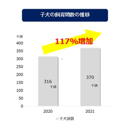 コロナ禍により在宅時間が増えたことなどもあり、子犬の飼育頭数が増加傾向にあります。具体的には2020年には31万6千頭だった子犬の頭数が、2021年には37万頭と約6万頭も増えています。
