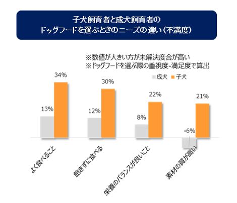 このようななか、子犬を飼育されている方は、成犬飼育者と比較して、ドライフードを選ぶときに「ワンちゃんがよく食べてくれること」「飽きずに食べること」「素材の品質が高いこと」などを重視することが分かりました。
