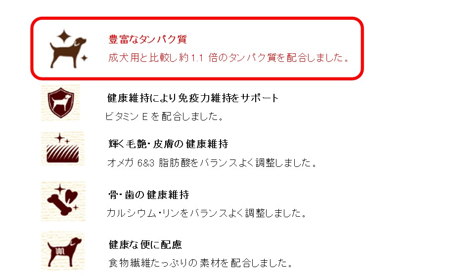 ・子犬の体作りに必要な「タンパク質」を、成犬用の1.1倍配合しました。