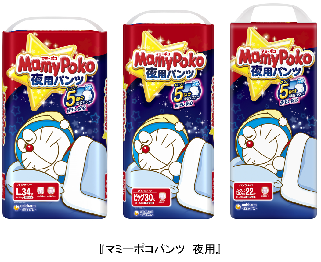 ユニ・チャーム株式会社(代表取締役 社長執行役員:高原豪久)は、多くの方にご愛用いただいている「ドラえもんデザイン」の『マミーポコ』ブランドから、夜専用の紙おむつ『マミーポコパンツ 夜用』を、2022年9月20日に全国で発売します。