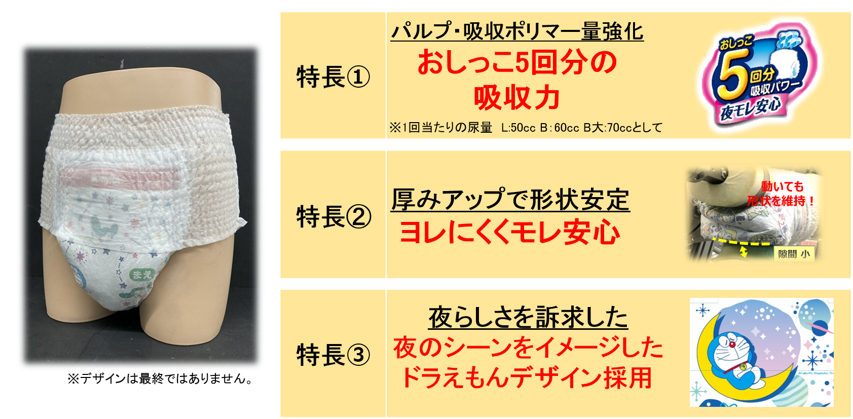 そこでこのたび、『マミーポコ』ブランドから、吸収力を強化し、5回分のおしっこを吸収する夜専用の紙おむつ『マミーポコパンツ 夜用』を発売します。