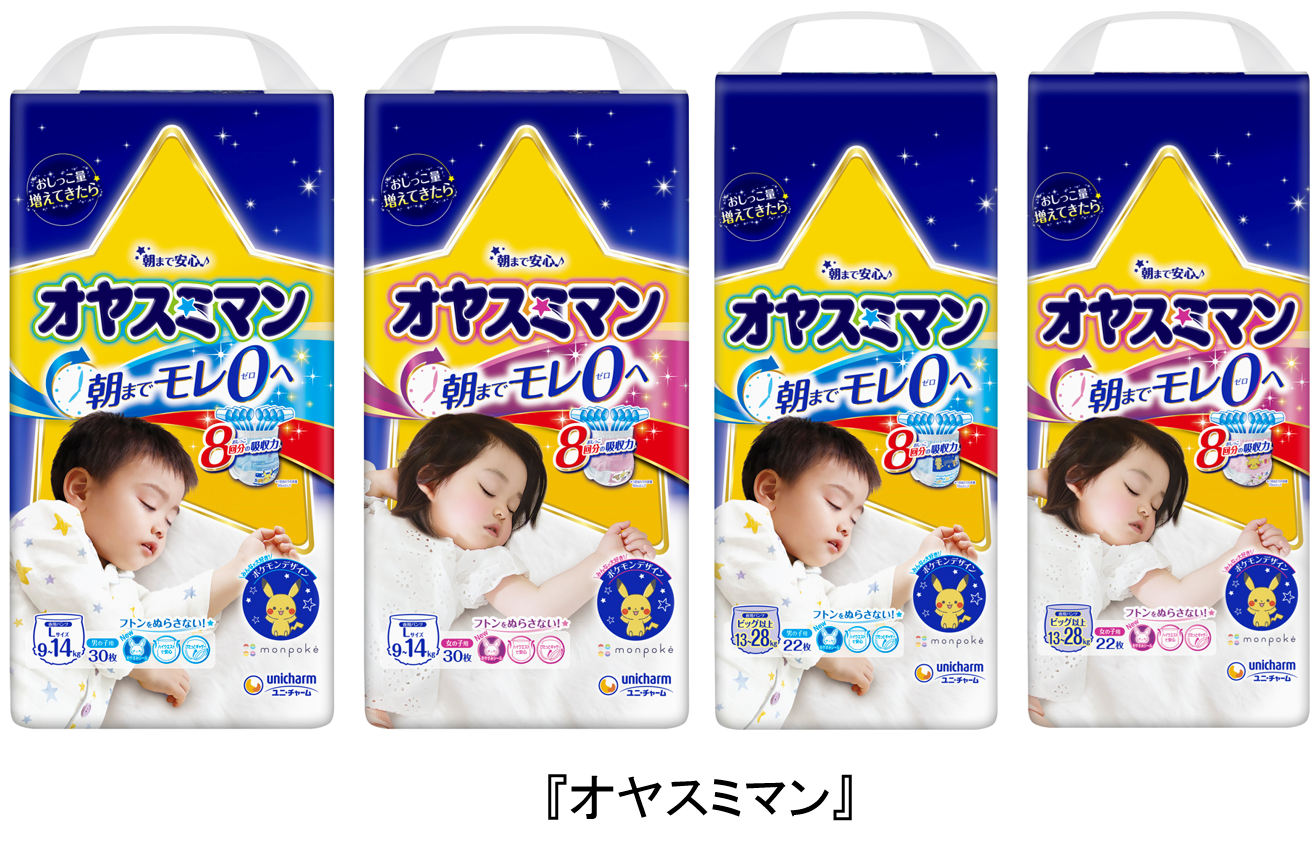 ユニ・チャーム株式会社(代表取締役 社長執行役員:高原豪久)は、夜専用パンツでシェアNo.1※の「オヤスミマン」の新デザインにポケモンを採用し、2022年11月上旬より全国で順次発売します。