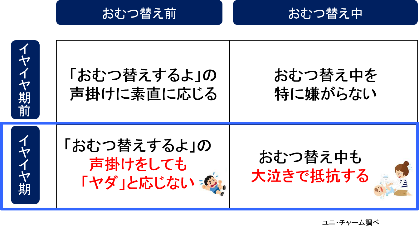 また、自我が芽生え、イヤイヤ期が本格化する2歳以降は、「おむつ替えをしていても、『ヤダ!』と応じず、大泣きで抵抗して大変・・・」とのお声もお寄せいただいています。