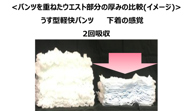 ・ウエスト部分の厚みを約2分の1※2のうすさにすることで、腰回りがゴワつかない軽いはき心地を実現しました。