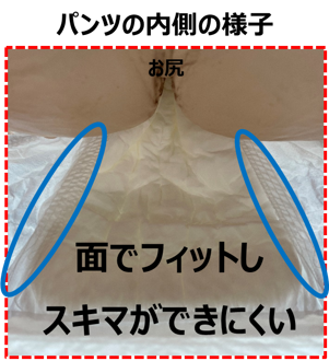 ・足まわりからお尻までをカバーする大きな立体ギャザーを搭載することにより、4回分の尿を吸収してもスキマができにくい。また、面でフィットするギャザーを採用することで、やさしい肌触りを実現しました。