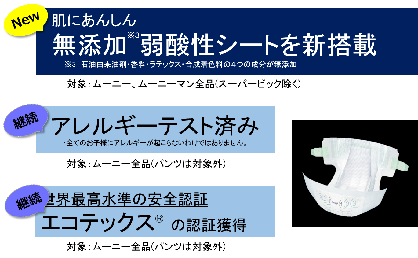 赤ちゃんの肌に触れるふわふわのシート(トップシート)に、 お肌に安心な“無添加※3弱酸性”シートを搭載します。また、ムーニーは全品「アレルギーテスト」を実施し、世界最高水準の安全認証「エコテックスⓇスタンダード100」を認証しました。