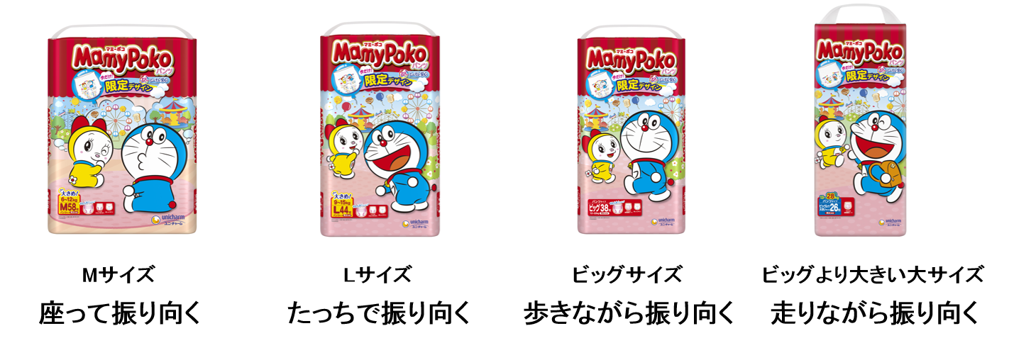 そこでこのたび、従来の機能はそのままに、お子さまが進んでおむつ替えができるように、遊園地をテーマにした「ドラえもん&ドラミちゃん」のオリジナルデザインの『マミーポコパンツ』を、期間限定品として発売します。