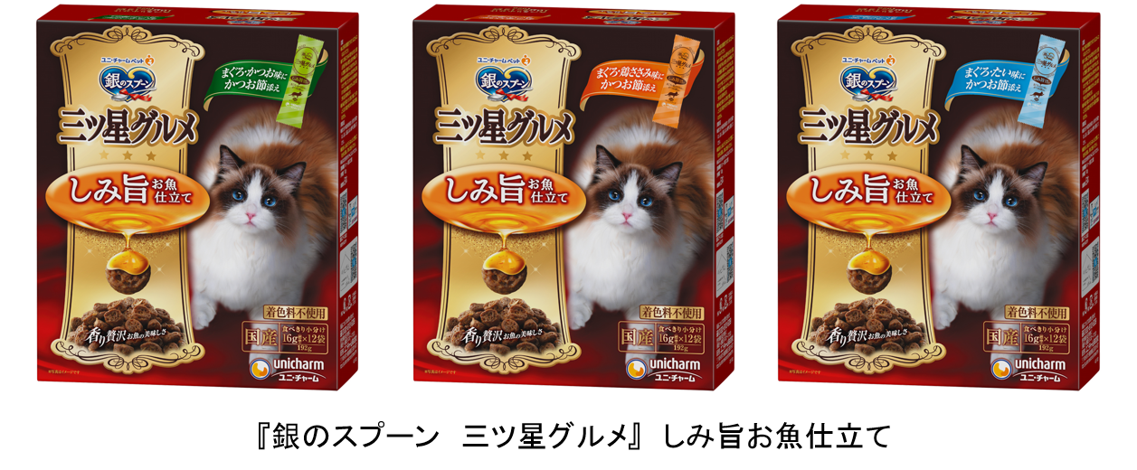 ユニ・チャーム株式会社(代表取締役 社長執行役員:高原豪久)は、愛猫の「食事に飽きっぽいことが気になる」という飼い主様の悩みにお応えし、『銀のスプーン 三ツ星グルメ』から「しみ旨お魚仕立て」を、2023年3月13日に全国で発売します。