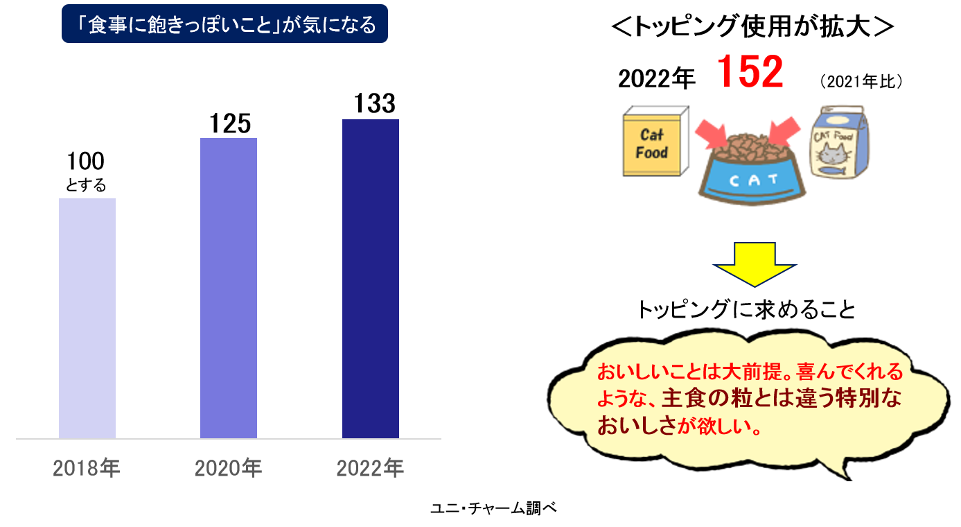 一方、コロナ禍によってご自宅で過ごす時間が拡大し、愛猫の食事を目にする機会が増えた飼い主様が増加しています。この「食事の様子を見る」機会が増えたことなどにより、“食べ飽き”に気がついた飼い主様は、対策として主食に「トッピング」するなどの工夫※をしていることが分かりました。なお、「トッピング」には“食べ飽き”を解消するような「主食用」とは異なる“特別なおいしさ”が求められていることも分かりました。