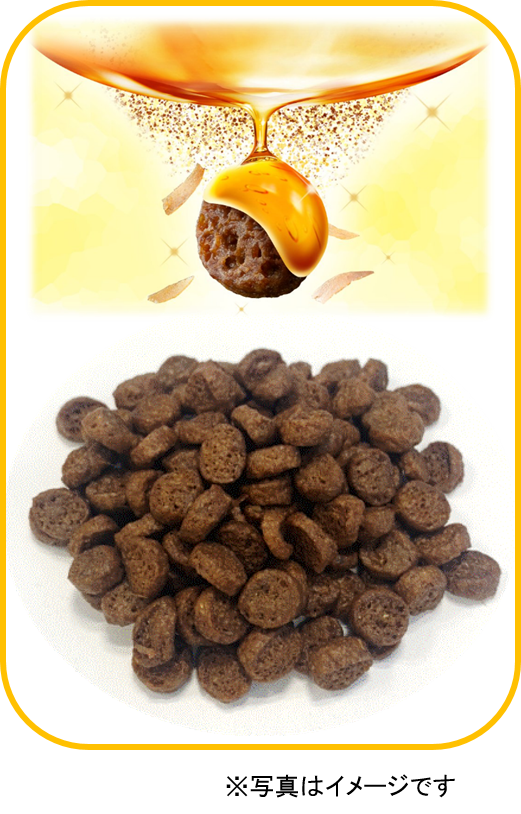 ・ 味がしみこみやすいサクっとした食感の旨み粒に、お魚味の旨みをたっぷりとしみこませた、ねこちゃんが喜ぶ深い味わいと香りです。