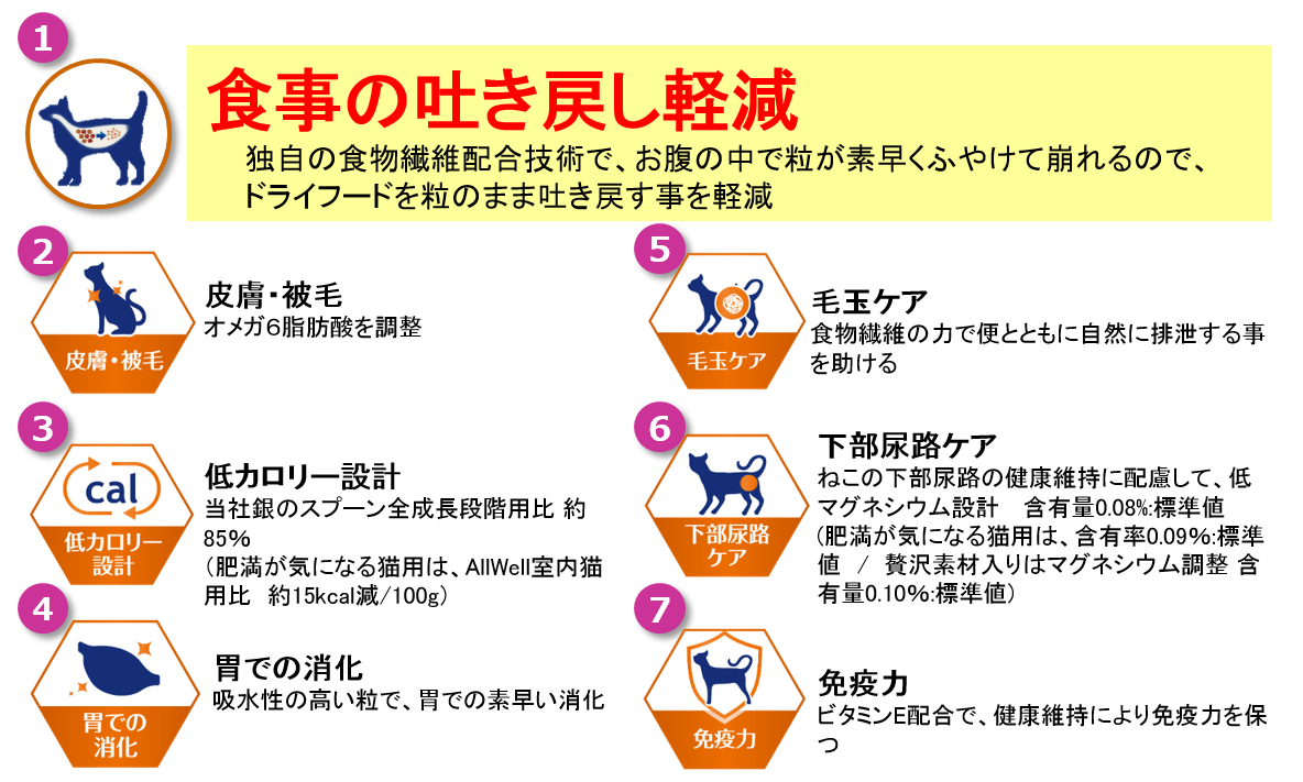 ・食事の吐き戻し軽減※3を中心とした7つの機能で健康をサポートします。(子猫用は機能が異なります)