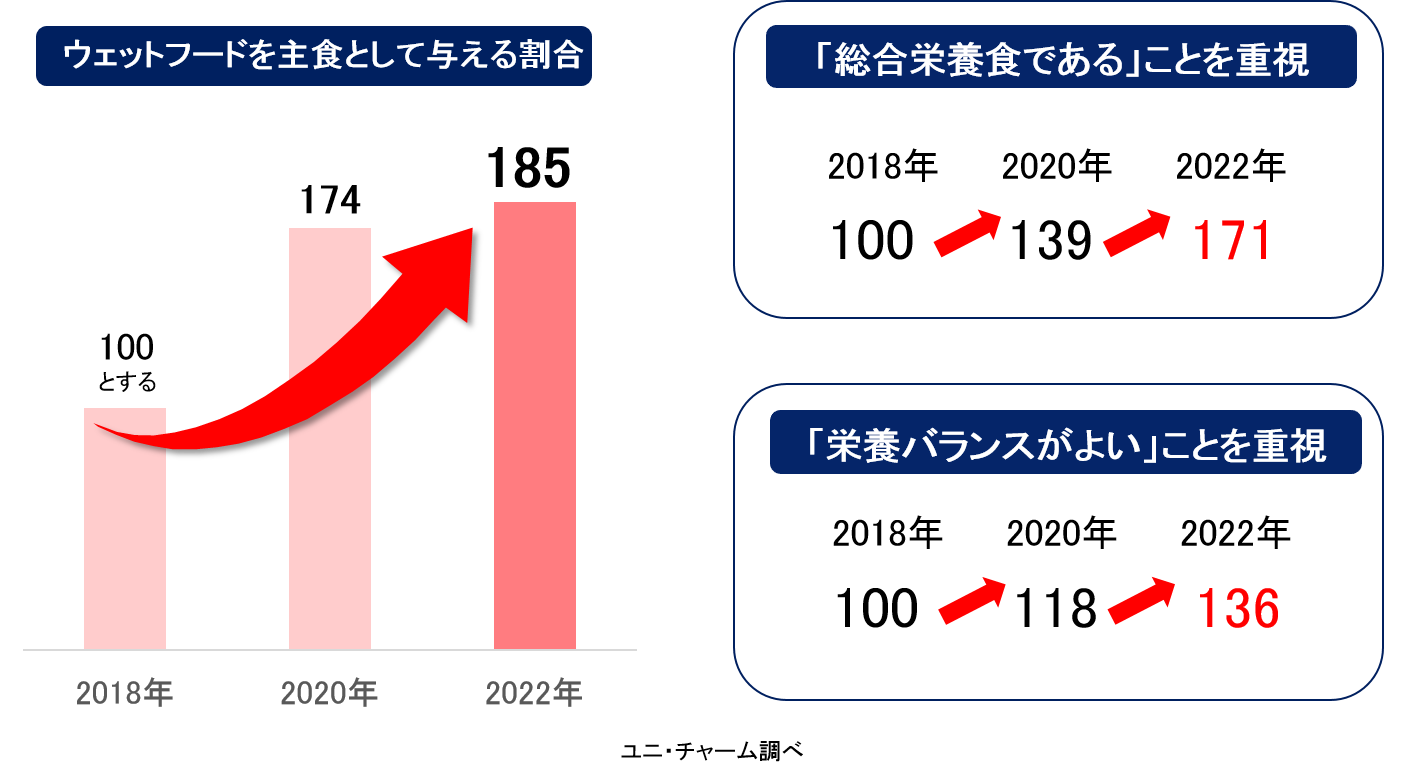 また、ウェットフードを主食として与える飼い主様が増加しており、味に加えて、健康・栄養に対する関心が高まっています。