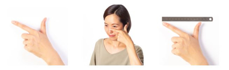 ② L字をつくった状態で、親指の先端を耳のつけ根(上部)の一番高いところに当て、人差し指の先端を鼻のつけ根から1cm下のところに当てます。