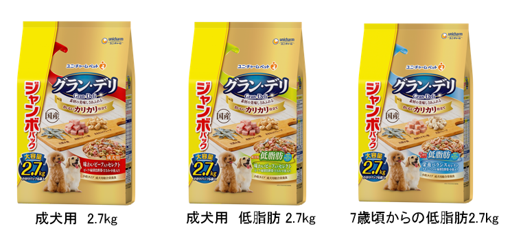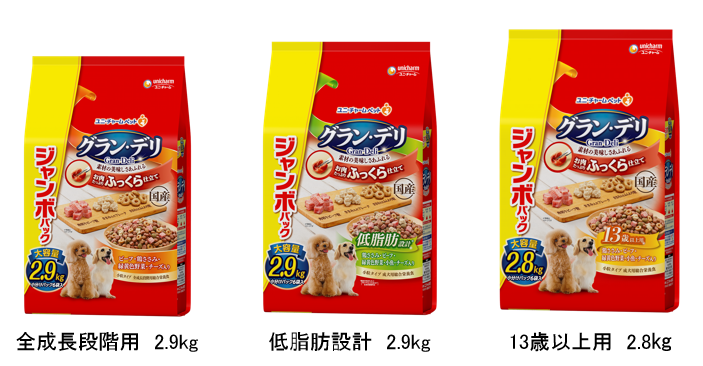 そこでこのたび、素材の美味しさにこだわったレシピで、多くの飼い主様からご支持をいただいている『グラン・デリ』の『カリカリ仕立て』と『ふっくら仕立て』から、大容量パックを、全国で発売します。