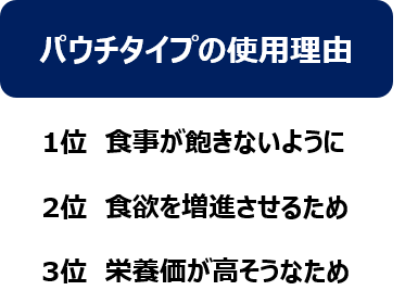 近年、「食べ飽きないように」や「食欲を増進させたい」などの理由から、パウチタイプのフードを使って愛犬に与える食事にアクセントを付ける方が増えています。また、与える食事においては「栄養バランスが良いこと」を重視する方も増えています。