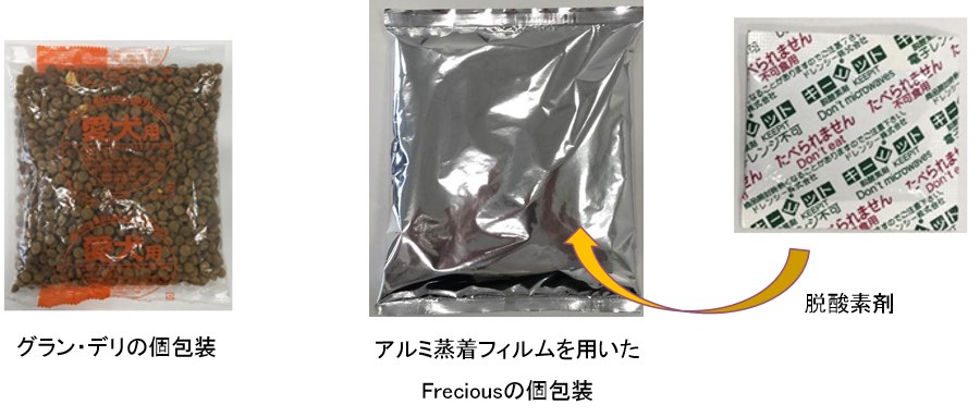 (3)鮮度維持のため“アルミ蒸着フィルム+脱酸素剤”による小分け包装を採用
