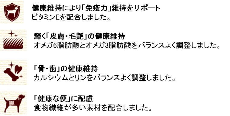 (4) 健康に欠かせない「免疫力」「皮膚・毛艶」「骨・歯」「健康な便」を考慮した栄養バランス