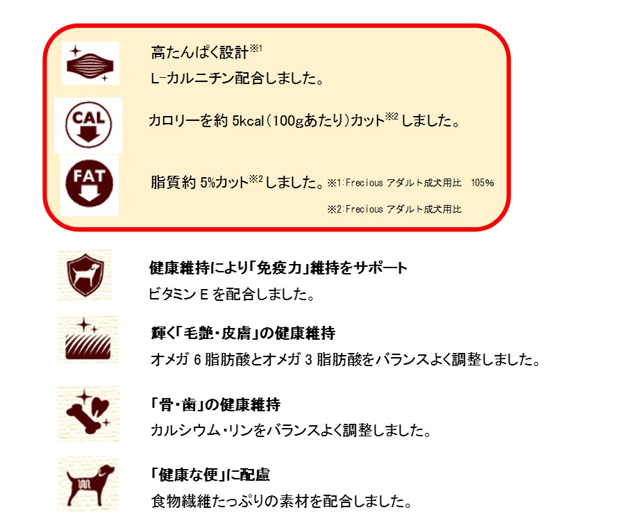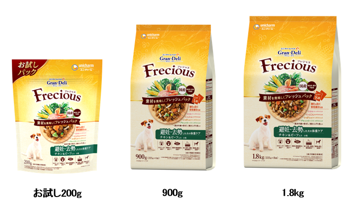 そこでこのたび、健康的な栄養バランスと美味しさを両立した『Gran-Deli Frecious』に、筋力維持の観点で「高たんぱく」「低カロリー」「低脂質」といった調整を加えた『Gran-Deli Frecious 避妊・去勢した犬の体重ケア』を、全国で発売します。