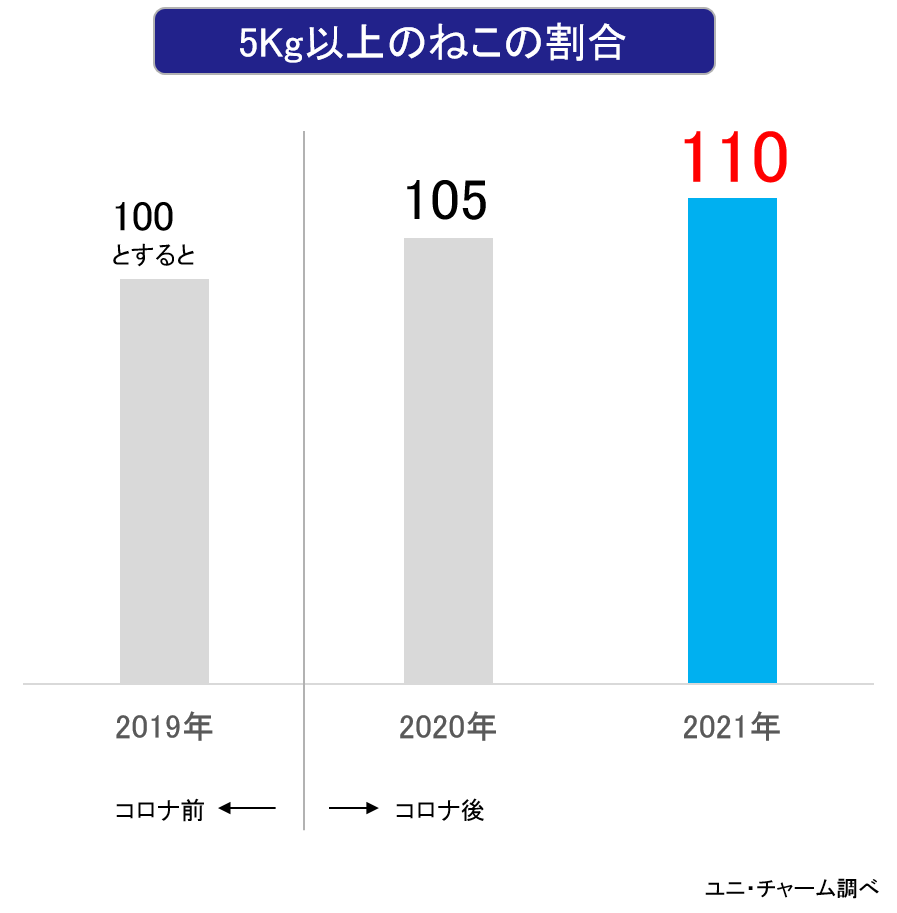 一方、コロナ禍で愛猫と触れ合う時間が長くなったことに伴い、おやつを与える頻度が高まったことなどから、5kg以上の大きなねこちゃんが増加しています。このような飼い主様からは「従来品ではサイズが合わず、着用を嫌がるので、大きなサイズがほしい」というご要望をいただいています。