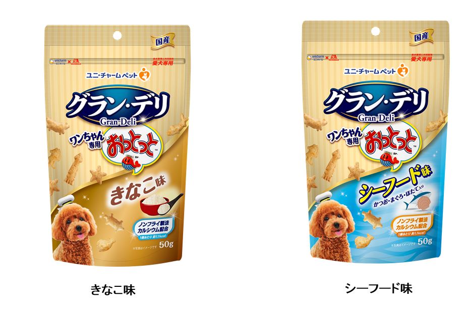 そこでこのたび“カリッ”とした食感を楽しめるおやつ『グラン・デリ ワンちゃん専用 おっとっと』から、“きなこ味”と“シーフード味”を、全国で発売します。