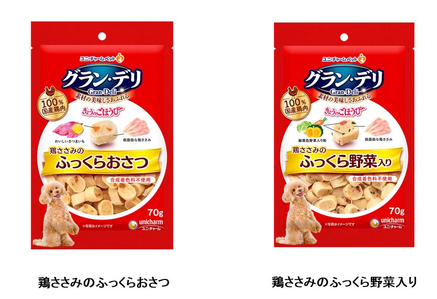 ユニ・チャーム株式会社(代表取締役 社長執行役員 : 高原豪久)は、ジャーキータイプのワンちゃん用おやつ『グラン・デリ きょうのごほうび』から、”ふっくらおさつ”と“ふっくら野菜入り”を、2023年3月13日に全国で発売します。