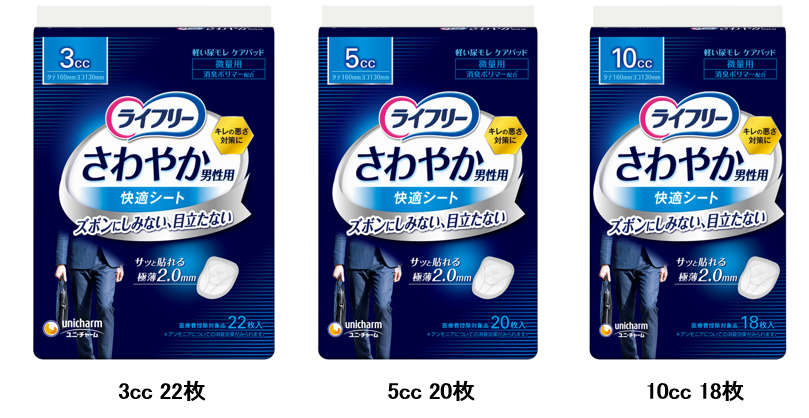そこでこのたび、下着のようなつけ心地を実現した『ライフリー さわやか男性用快適シート』を全国で発売します。なお、吸収量は3㏄、5cc、10㏄の3種類をご用意しました。