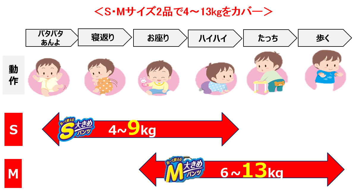 ベビー用紙おむつにはウエスト部分の仕様が異なる「テープタイプ」と「パンツタイプ」の2種類があります。多くの場合、生まれたばかりの赤ちゃんは横になった姿勢で過ごすため、テープタイプの紙おむつをご利用になります。その後、“寝返り”や“はいはい”ができるようになり、運動量が増えるタイミングでパンツタイプへと移行します。お子さまの成長に合わせて、ひと回り大きなサイズや、より動きやすいパンツタイプへと移行することは喜ばしい反面、「紙おむつの1枚当たりの価格が上がってしまう」といったお悩みも生まれます。このため、「経済性を考えると、できるだけ同じサイズを長く使いたい」というご要望もお寄せいただいています。