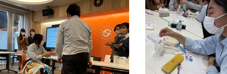 ロールプレイ(生理期間中の女性への対応)の様子 タンポンの吸収実験の様子