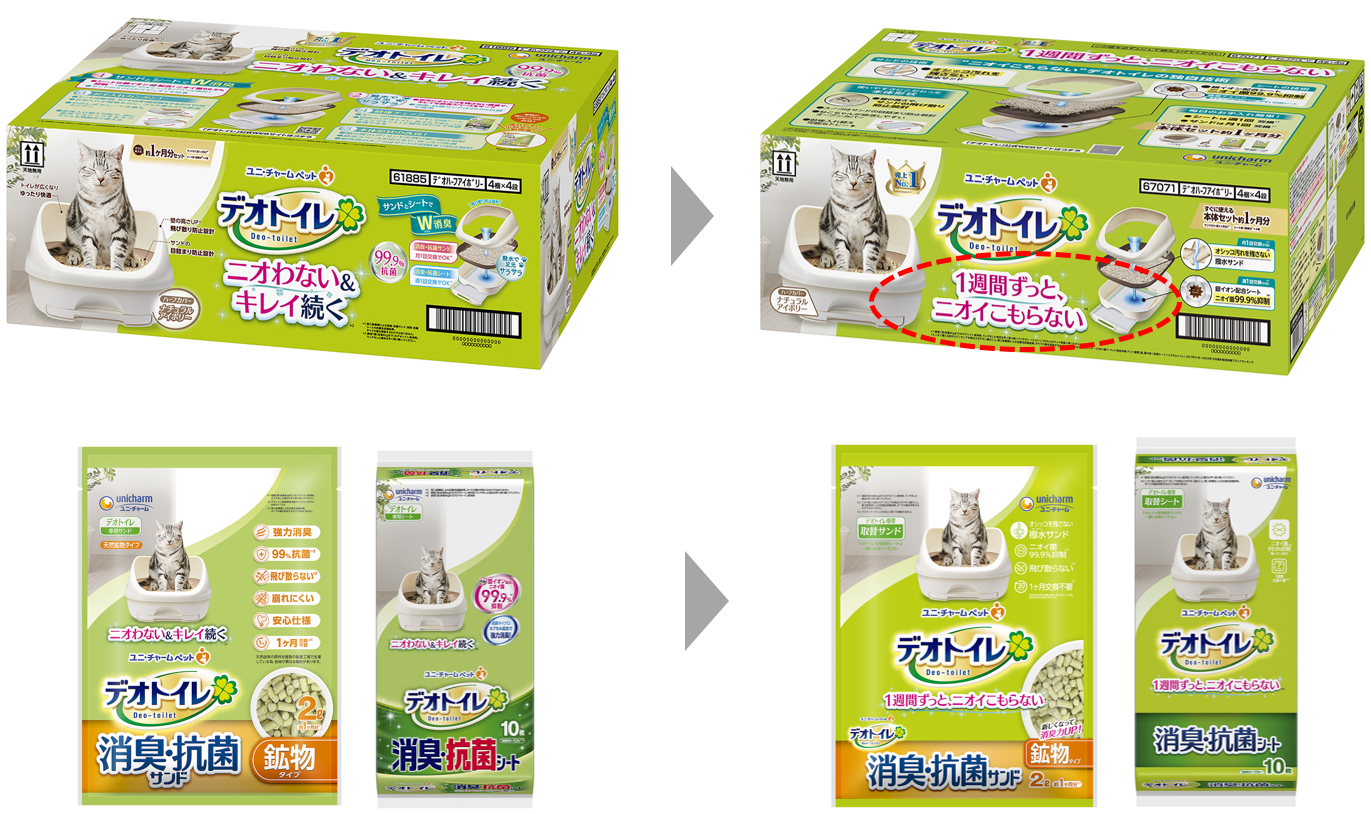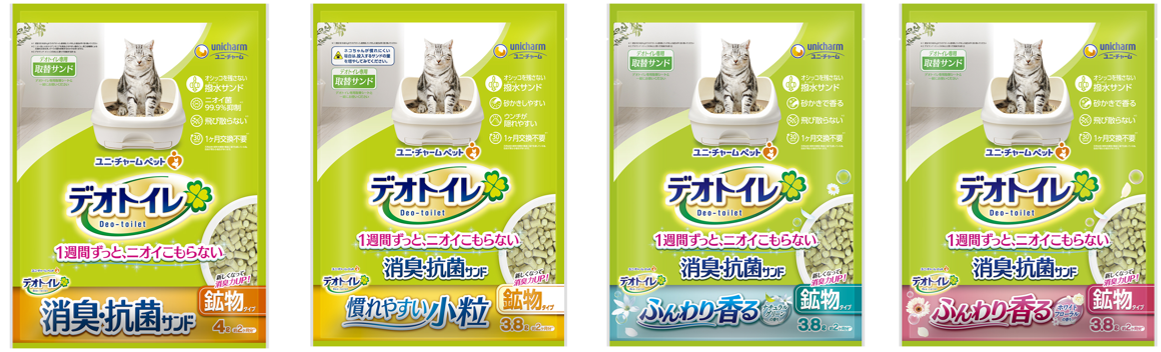 ユニ・チャーム株式会社(代表取締役 社長執行役員:高原豪久)は、多くの飼い主様にご支持いただいている、猫用システムトイレ『デオトイレ』の「消臭・抗菌サンド」「ふんわり香る消臭・抗菌サンド」の消臭力を強化して、4月下旬より全国で順次発売しました。