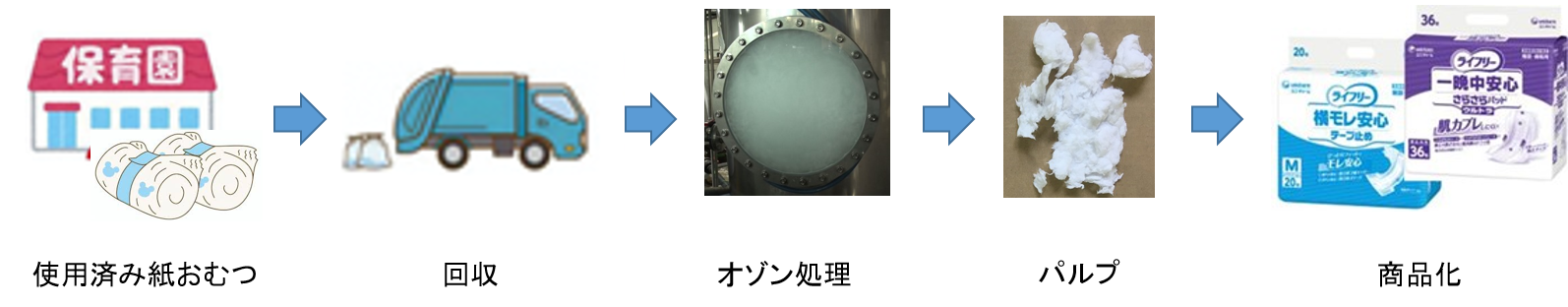 <保育園施設から使用済み紙おむつを回収、資源化までの流れ>