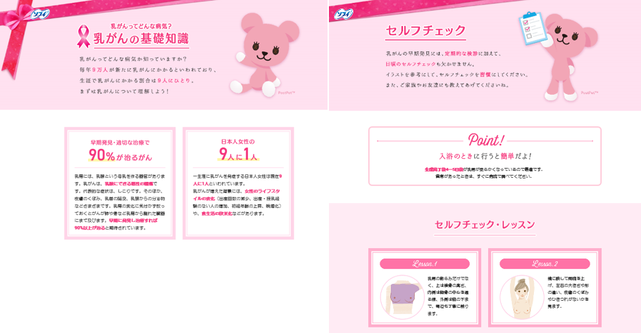 「ピンクリボン活動」を正しく理解いただくことを目的に、活動内容をはじめ、乳がんに関する基礎知識や早期発見のためのセルフチェック方法等を「ソフィ ピンクリボン活動特設サイト」に掲載します。