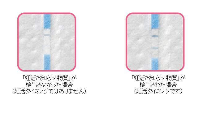 - おりものに反応し「妊活おしらせ物質」を検出すると、判定サイン部分に2本線が現れ、検出しなかった場合は1本線が現れます。