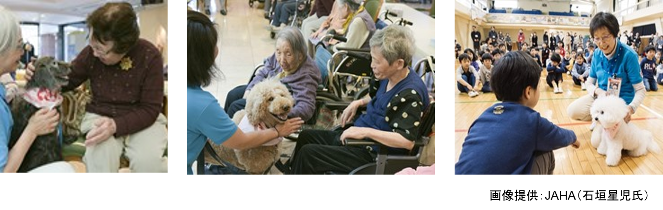 <JAHAを通じたアニマルセラピー犬などの動物介在療法の様子>