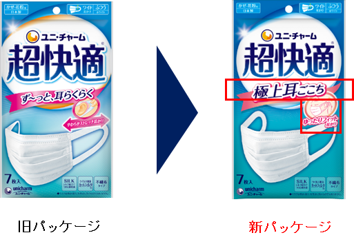 そこでこのたび、耳が痛くなりにくい特長がひと目で伝わるように、商品名を『超快適マスク 極上耳ごこち®』に変更し、これにともないパッケージデザインも刷新します。