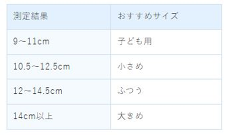 ④ お顔のサイズが測れたら、下の表を参考にマスクのサイズをお選びください。