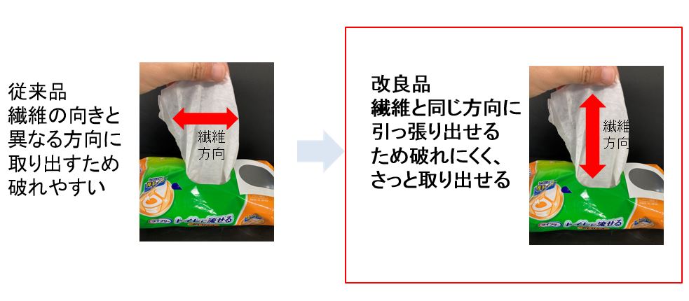 ・シートを取り出す際に引っ張る方向と繊維の方向とを一致させることで、破れにくく、サッと取り出すことができます。