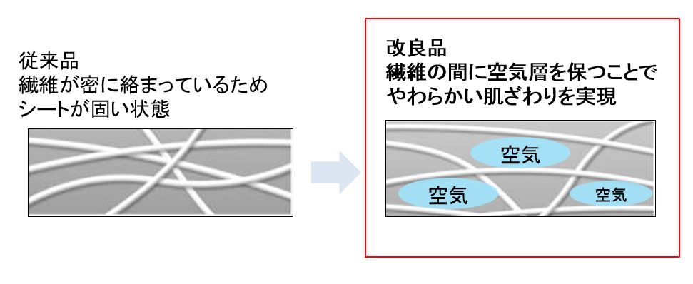 ・従来品に比べて不織布の繊維の間に“空気の層”を設けることで、やわらかい肌触りを実現しました。