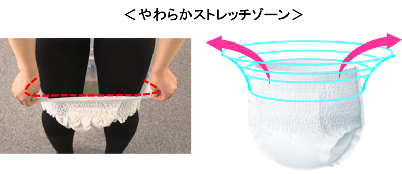 ・ウエスト部分に「やわらかストレッチゾーン」を設け、軽い力でも約2倍に広がります。