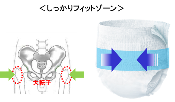 ・ ウエスト下部に「しっかりフィットゾーン」を設け、大転子※2から大臀筋に沿ってフィットし下腹部を支える構造のため、排尿後もパッドの重みで紙パンツがずり落ちにくい設計です。