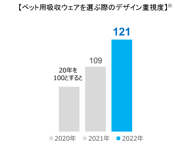 近年、20~30代を中心に、愛犬とおでかけを楽しまれている様子をSNSなどで発信する飼い主様が増えています。こうした飼い主様は、ペット用吸収ウェアを購入する際、愛犬の洋服や小物と合わせやすいシンプルなデザインを好む傾向にあることが分かりました。※