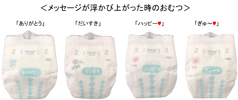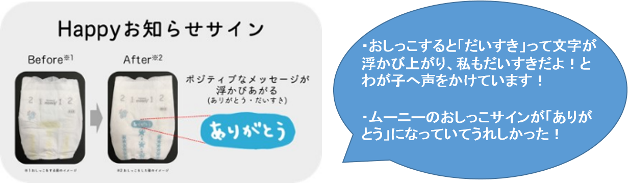 日本において年間出生数の約半数は第一子※1です。このため、初めて子育てをする保護者の多くは、育児に不安を抱いています。なかでも一日に何回も交換しなければならない紙おむつは、「正しい着け方がわからない」や「交換に自信がない」という方が多くいらっしゃいます。一方で紙おむつの交換は赤ちゃんとのコミュニケーションの時間でもあります。このため、当社では、赤ちゃんのおしっこに反応して「ありがとう」や「だいすき」といったポジティブなメッセージが浮かびあがる“Happyお知らせサイン”を2019年にムーニーブランドの一部で採用するなどし、多くの保護者より好評をいただいています。 そこでこのたび、『ムーニーナチュラル』『ムーニー』の新生児・Sサイズに、誰でも正しく簡単に装着できる「おしりガイド」のマークを搭載します。さらに“Happyお知らせサイン”に「ハッピー♥」「ぎゅ~♥」の2種類を追加して発売します。