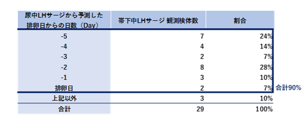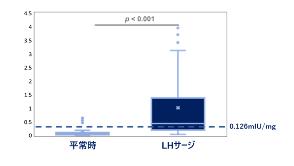 ・おりもの中にLHが見られる日とその前日を比較し、LHの強さを測定した結果、おりもの中のLHは0.15 mIU/mgにおいて感度86%でした。