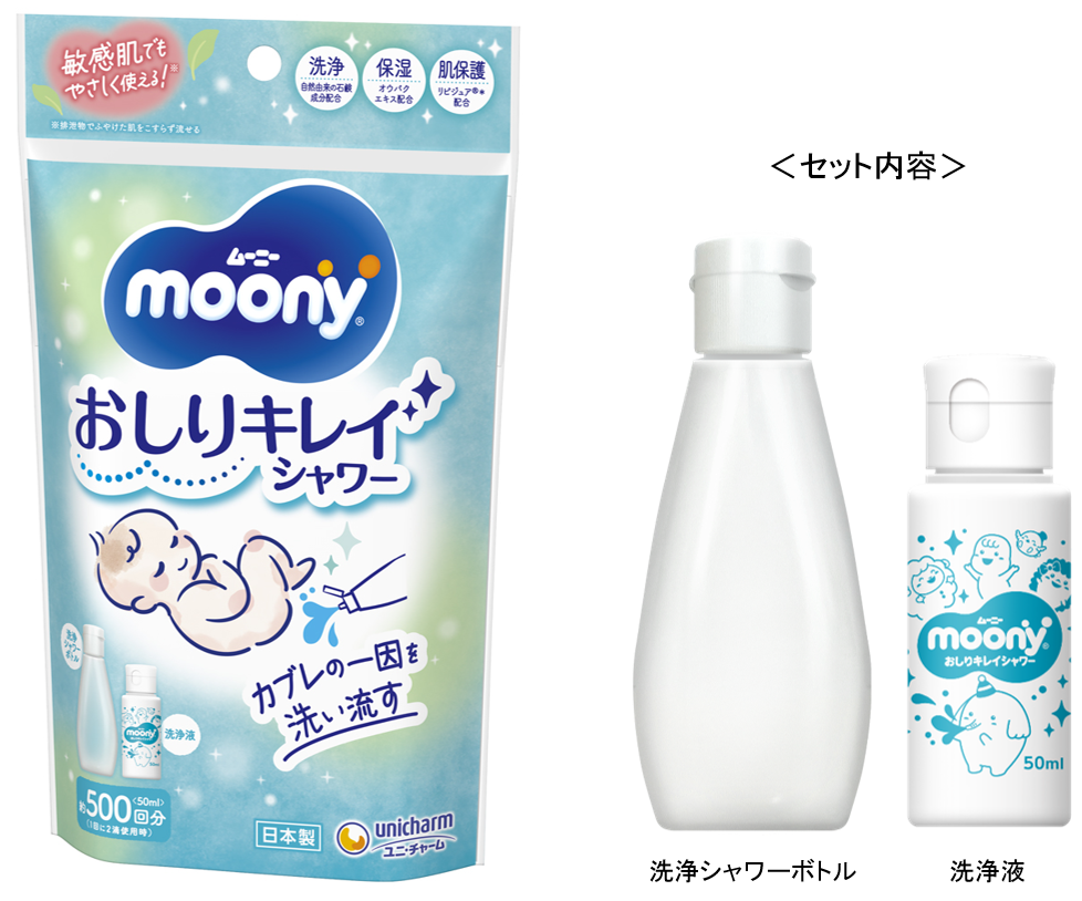 そこでこのたび、おしりカブレの一因であるうんちやおしっこを洗い流し、お肌の保湿や保護に効果的な『ムーニー おしりキレイシャワー』を発売することとしました。